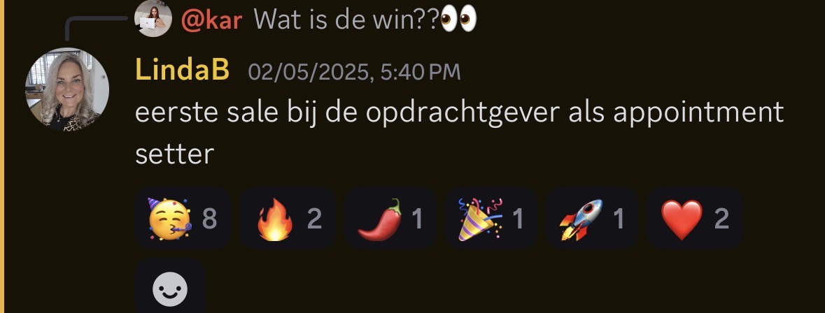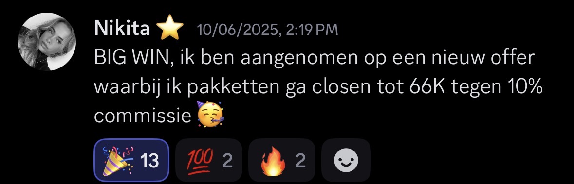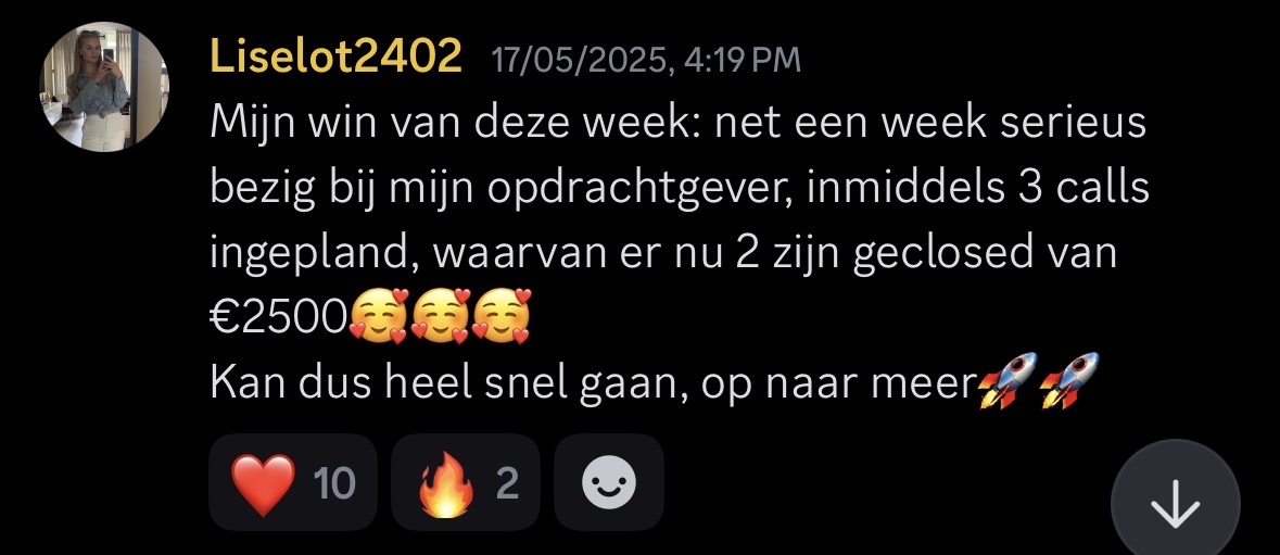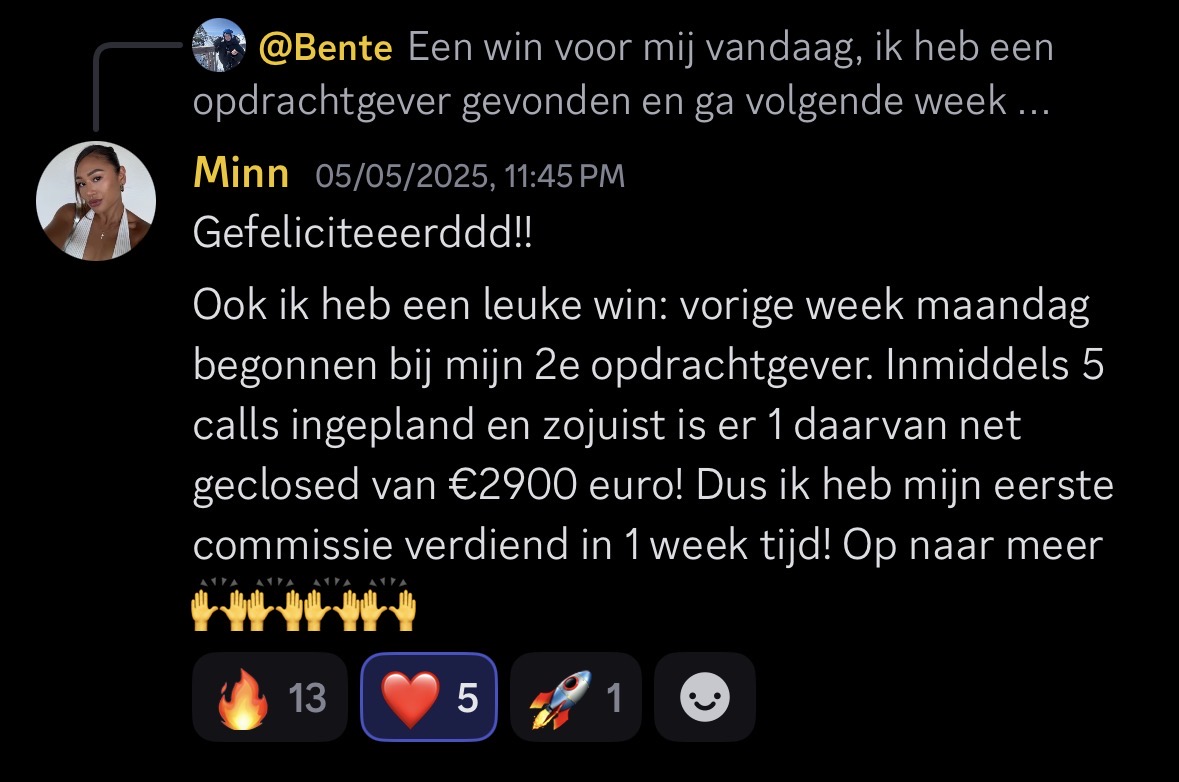 1,5 maand geleden gestart in deze Ecommunity met het verdienmodel Appointment Setting. Wat me direct opviel was de positieve en motiverende sfeer. Je zit echt tussen gelijkgestemden die allemaal willen groeien. De begeleiding is ook top! Je wordt continu gemotiveerd om stappen te zetten. Dat heeft er bij mij toe geleid dat ik inmiddels 3 opdrachtgevers heb, en mijn eerste inkomen al heb binnengehaald! 🤩