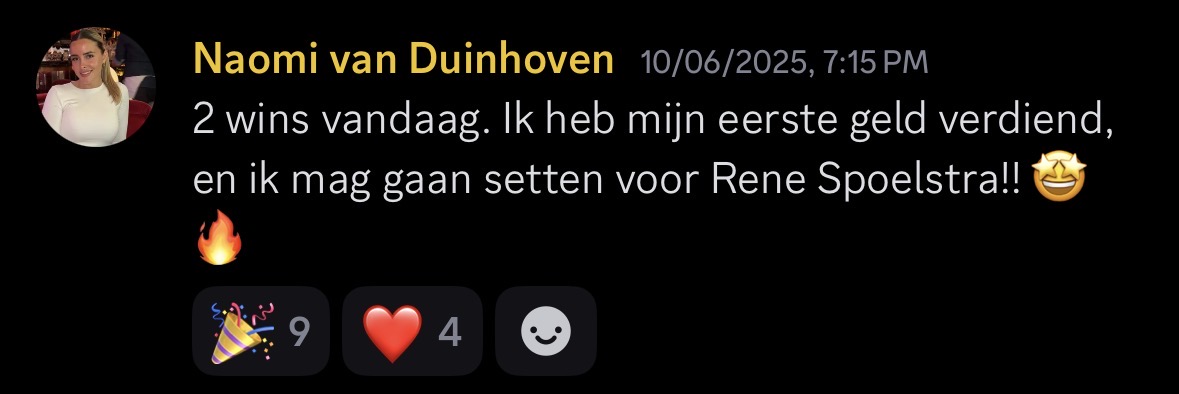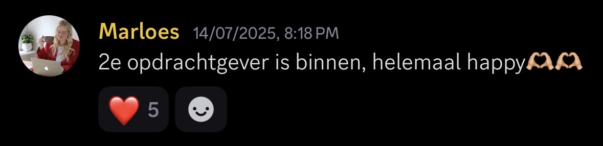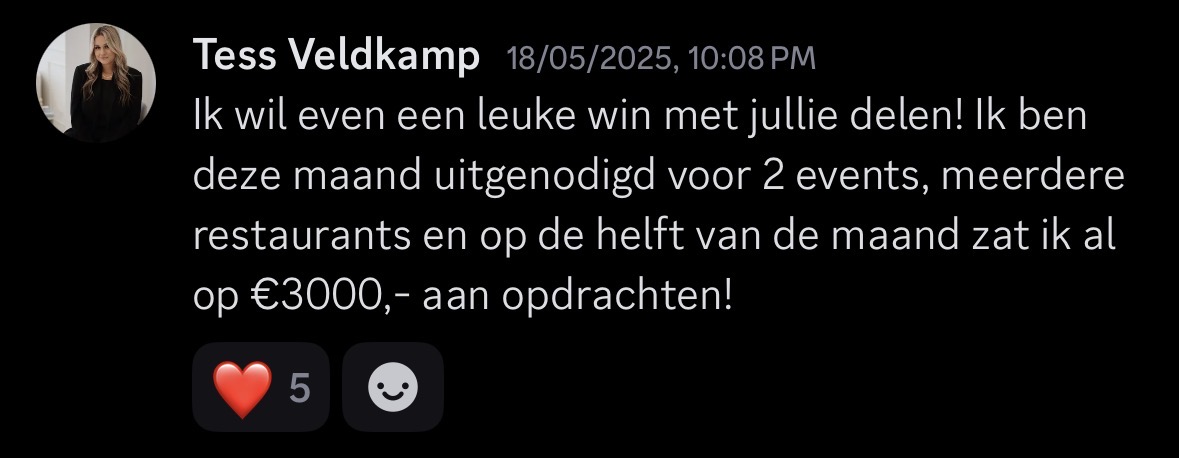 Een super fijne community waar iedereen elkaar helpt, inspireert en samen successen viert. Je voelt je direct welkom en krijgt altijd waardevolle tips en steun en je wordt gemotiveerd om het beste uit jezelf te halen.